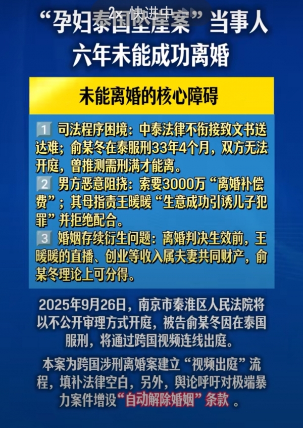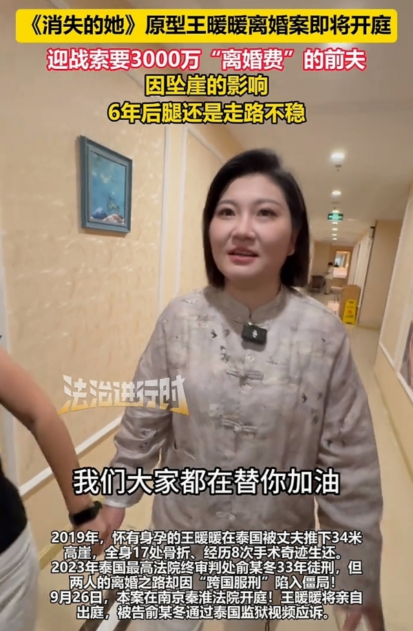 被丈夫从34米悬崖推下6年后,王暖暖的离婚案终于要开庭了。9月26日,南京秦淮法院将审理这起国内首例被告在国外服刑的离婚案,俞晓冬会在泰国监狱通过视频连线应诉。可谁能想到,光是等这个开庭日,就耗了她近两年时间,而按最初的程序走,她得等到70岁才能离婚。